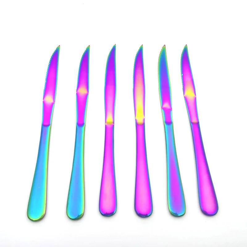 Colorful Kitchen Knives Kitchen knives are a utensil that we use every day but don't give a lot of thought to. This picturesque work of art is a conversation there are so many beautiful, colorful, interesting looking knives. Set of six colorful knives.