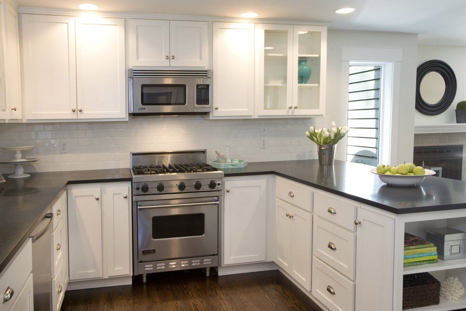 Providing a neutral backdrop, white kitchen cabinets can be left alone or dressed up with colorful when using the duo in a kitchen with white cabinets, keep the look from becoming theatrical by practicing restraint. Providing a neutral backdrop, white kitchen cabinets can be left alone or dressed up with colorful when using the duo in a kitchen with white cabinets, keep the look from becoming theatrical by practicing restraint. Black transitional kitchen design with contemporary black cabinets with stainless steel hardware along with stainless steel appliances and dark wood floor. This is one of the best black kitchen.